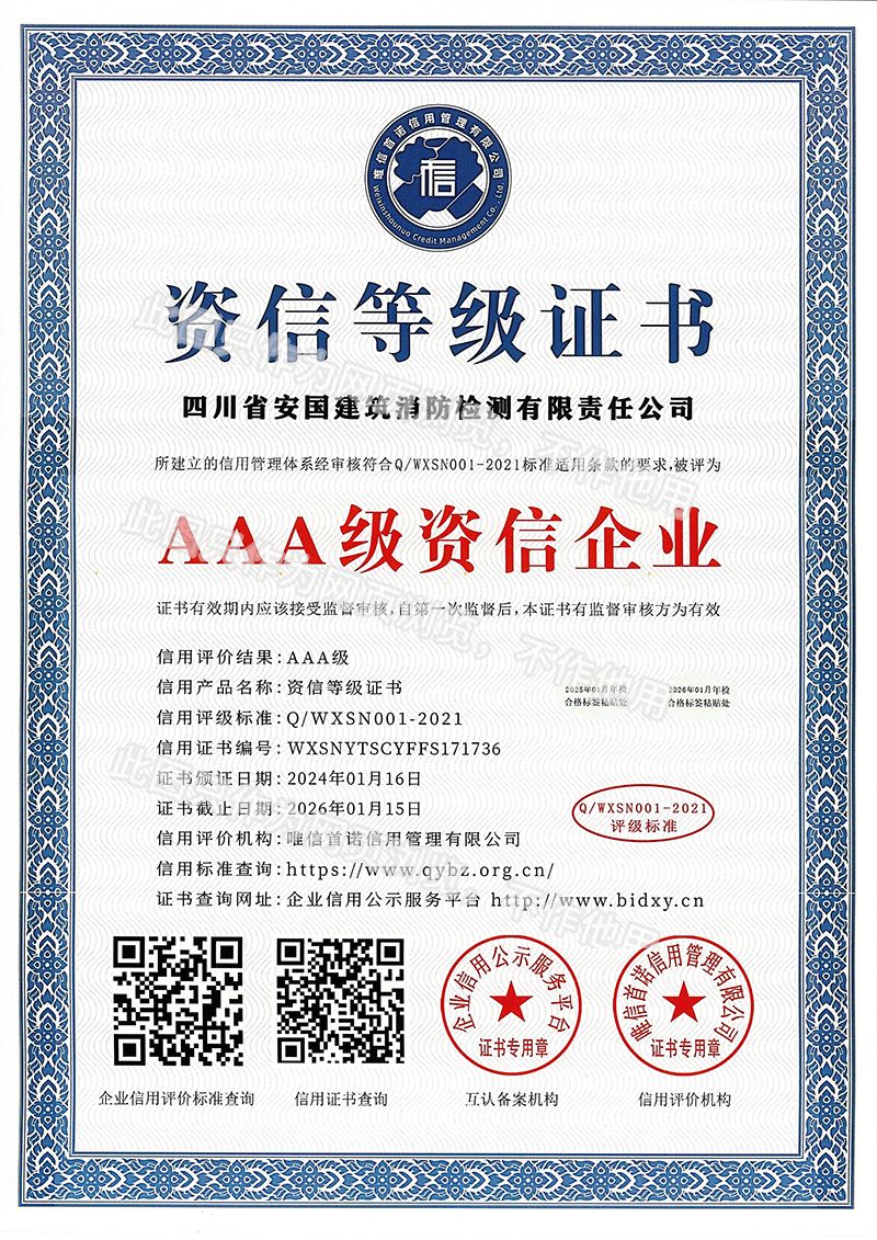 四川省安國建筑消防檢測有限責任公司,成立于1998年,經四川省公安消防總隊批準,工商部門注冊的獨立法人單位。 公司具有建筑消防設施檢測、電氣防火安全檢測、維修、保養及技術咨詢一級資質的中介技術服務機構,獲得CMA計量認證。主要業務范圍是:接受建設單位或有關單位委托,承擔新建、改建、擴建建筑自動消防設施技術檢測、電氣防火安全檢測、以及承接建筑消防設施維護保養,對已交付使用的建設消防設施的運行情況進行運行檢測,開展建筑消防設施的消防安全技術咨詢。公司設辦公室、總工辦、財務部、檢測部、維保部等職能機構,擁有一